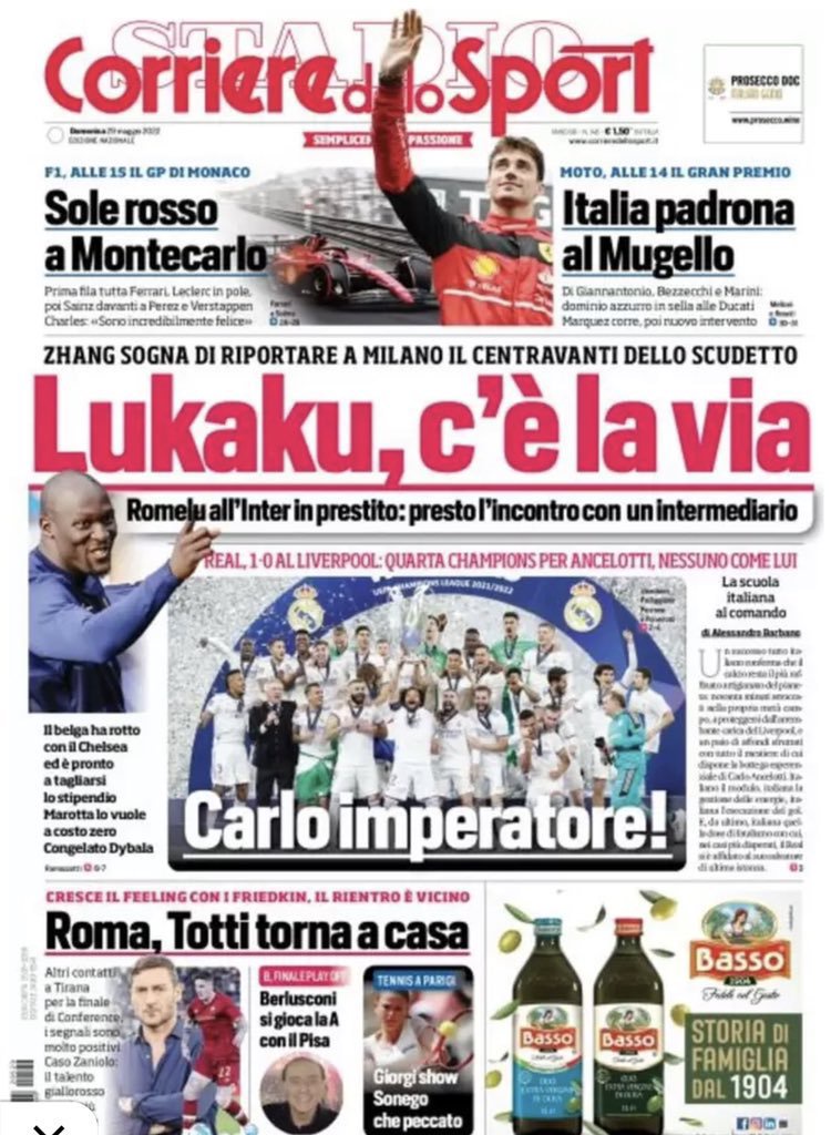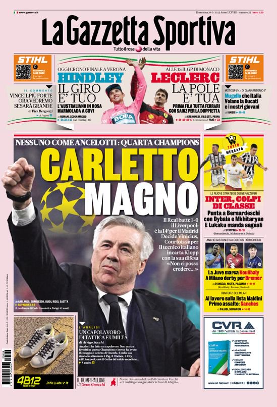 وقالت الصحيفة الإيطالية: “لا أحد مثل أنشيلوتي (اللقب الرابع لدوري الأبطال)”.