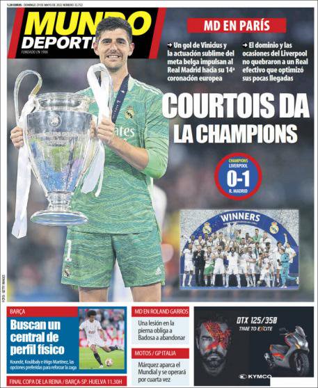 وقالت الصحيفة إن هدف فينيسيوس جونيور في الشوط الثاني حسم اللقب رقم 14 للأسبان بعد الفوز 1-0، لافتة إلى تألق تيبو كورتوا.