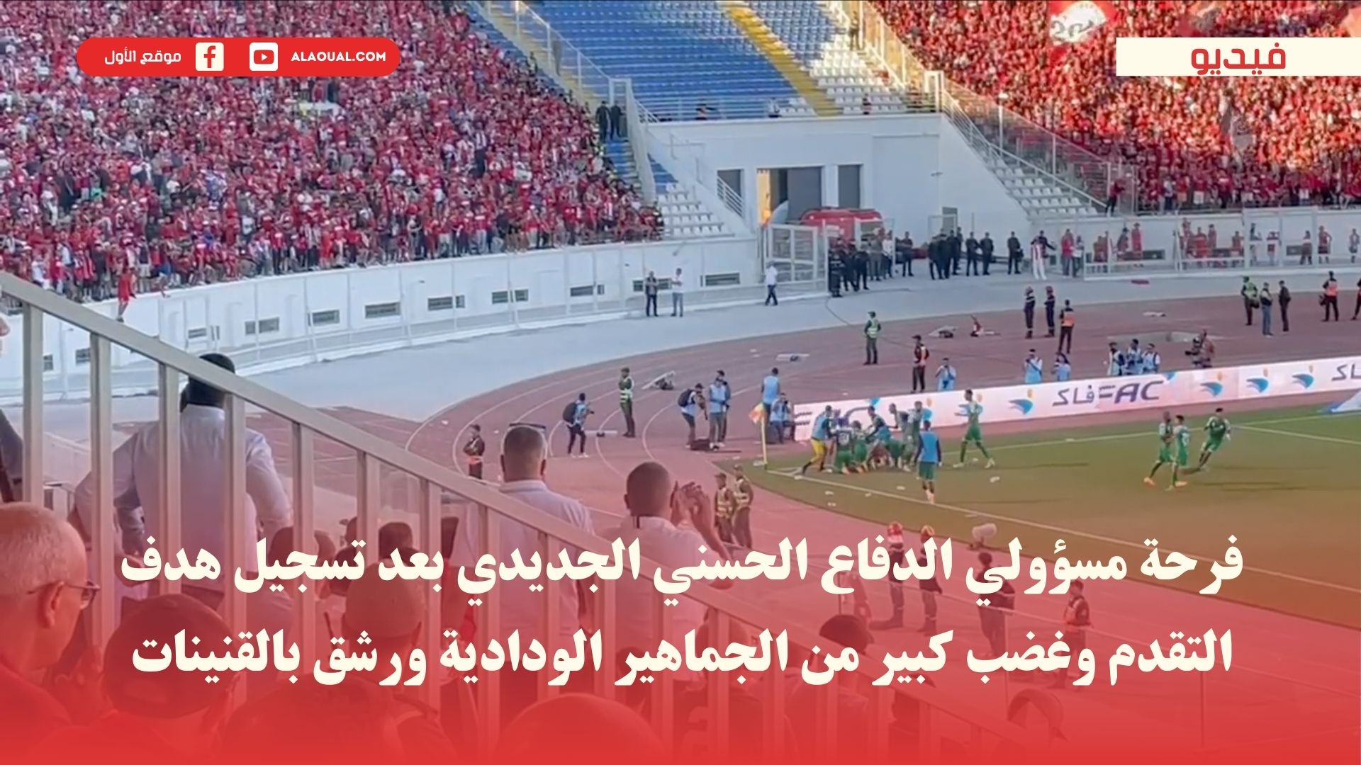 فرحة مسؤولي الدفاع الحسني الجديدي بعد تسجيل هدف التقدم وغضب كبير من الجماهير الودادية ورشق بالقنينات